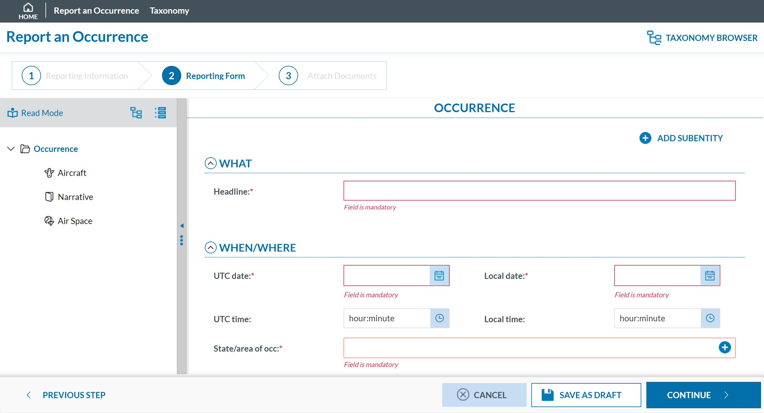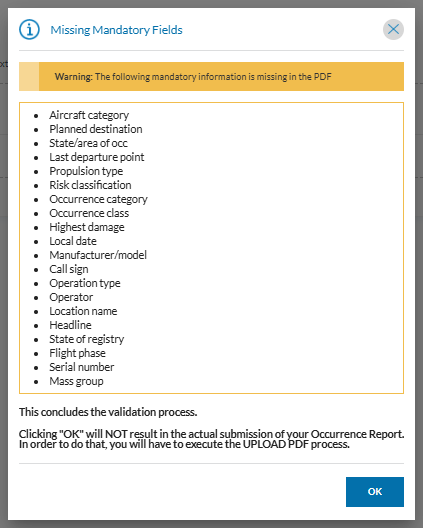 If any mandatory fields are left incomplete, a warning message will appear indicating which fields are missing. If you do not have the required information at the moment, you may still proceed by clicking 'SUBMIT'. However, the UTC Date, Reporting Entity and Report identification are the only fields required in order to submit a report.