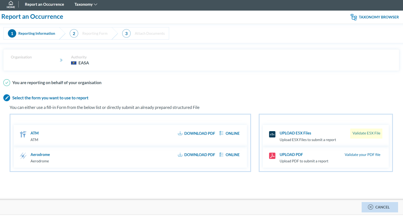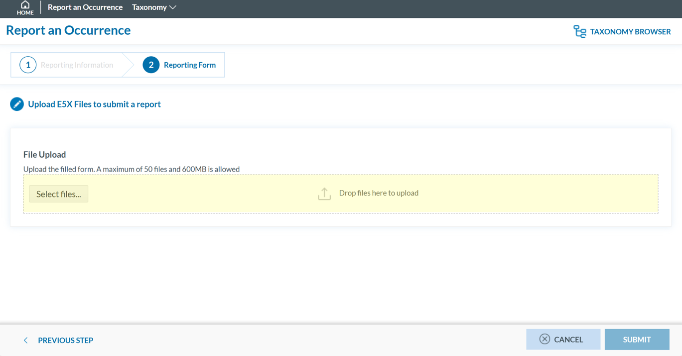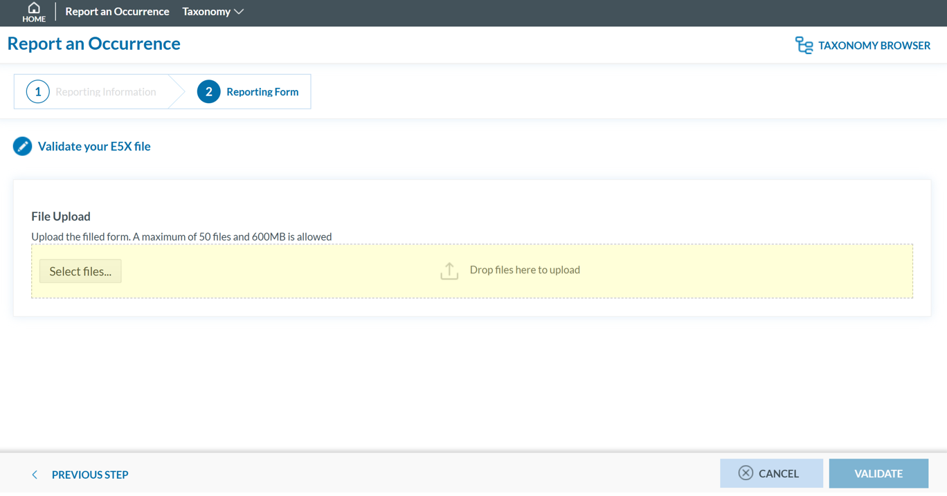 Only organisations are allowed to report using E5X files. These files must be generated in advance by an external system. This section outlines how to validate an E5X and how to report using an E5X.