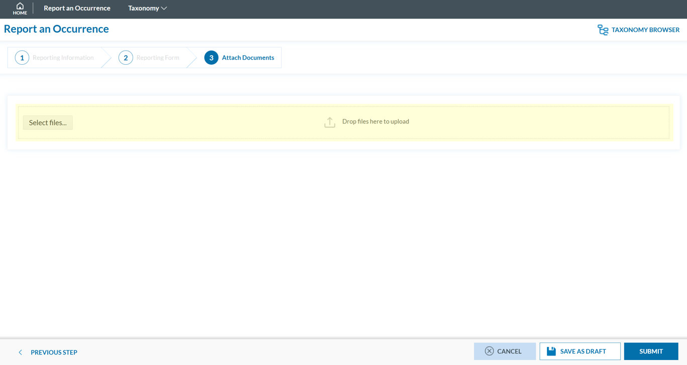 If needed, you can return to the previous step using the 'PREVIOUS STEP' button. In the 'Report Form' section, you can replace the uploaded report by clicking the pencil icon to the right of the document name. In the 'Attach Documents' section, you can upload additional files or remove them by clicking the 'X' icon.