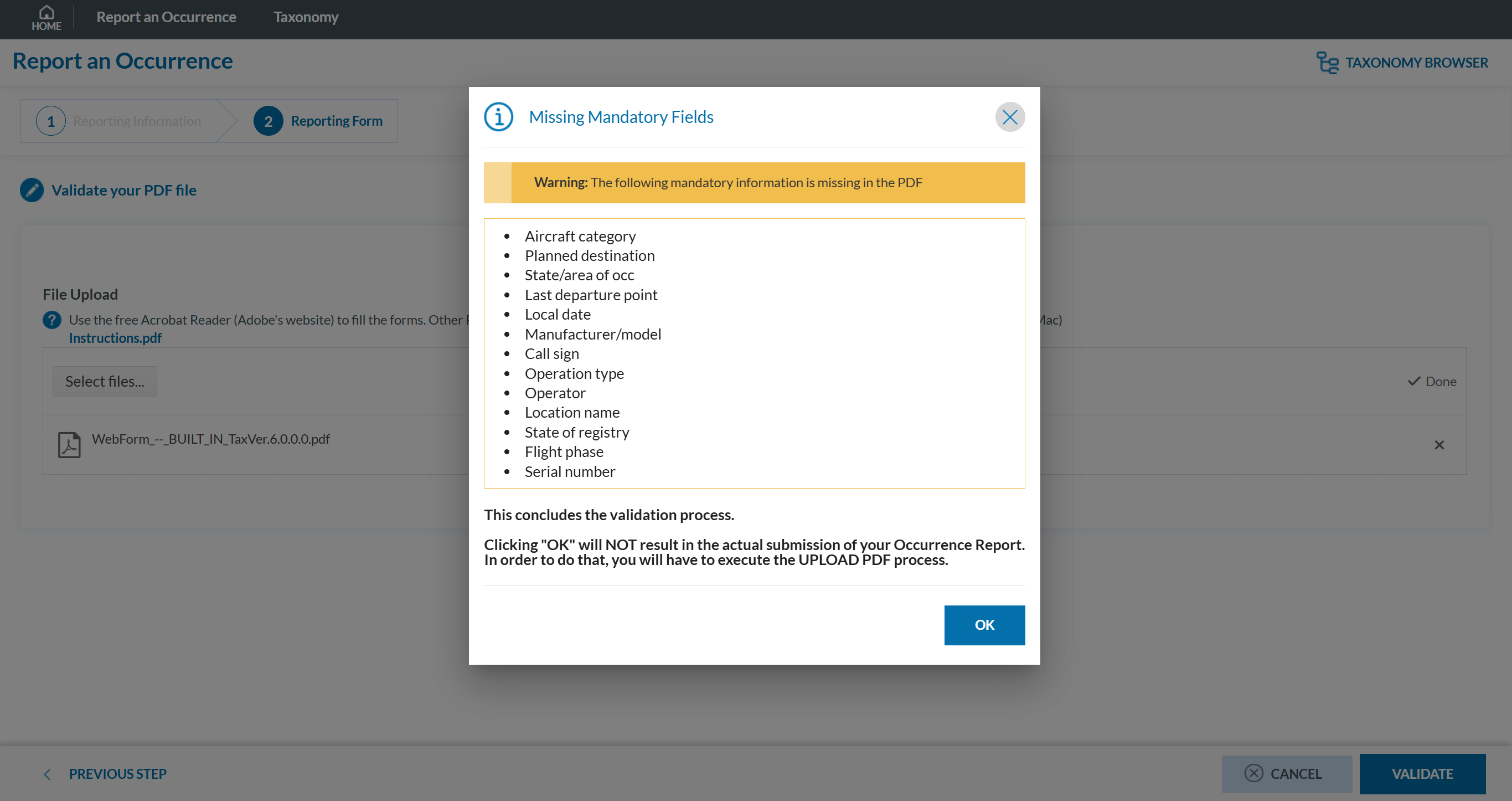 - Click 'VALIDATE'. The system will either display a message stating 'Your PDF has been successfully validated' or highlight the mandatory fields that are missing in the PDF: