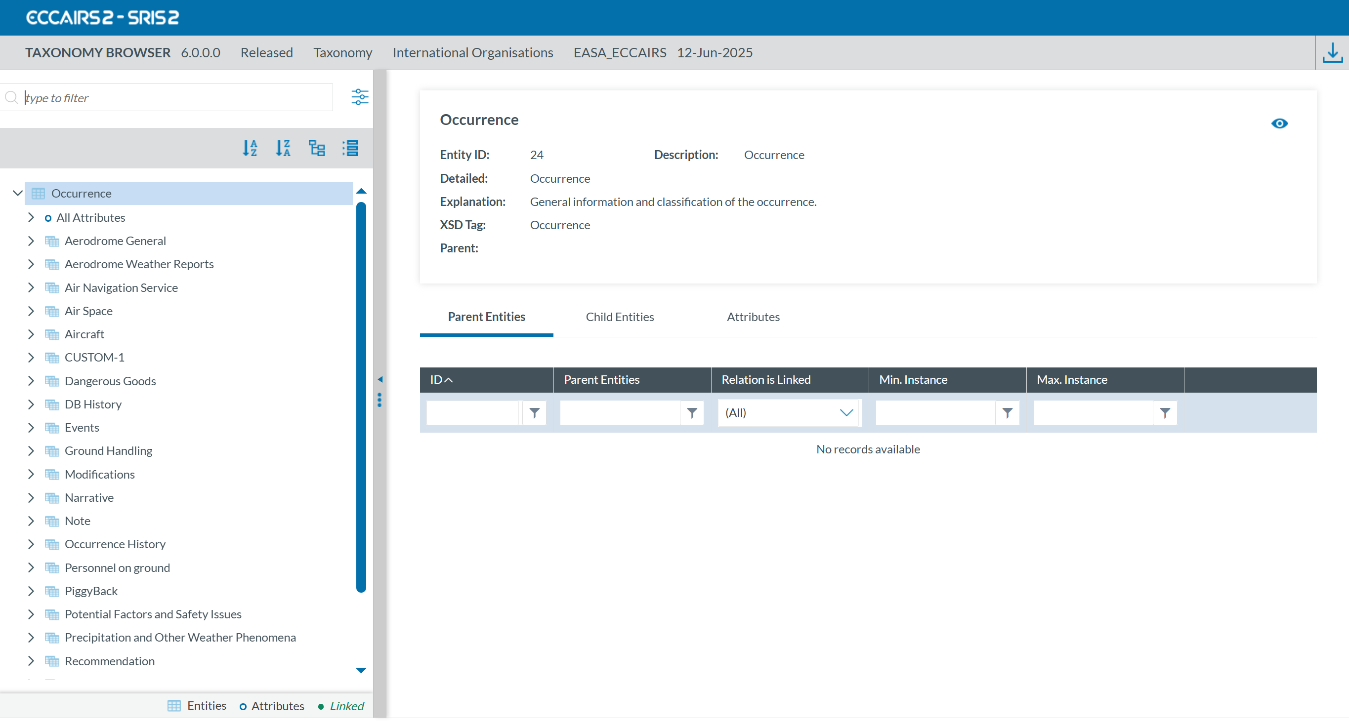 The ECCAIRS2 Taxonomy is publicly available and serves as the standard reference for all Occurrence Reports. Users can access the latest published version without registration. Additionally, Authorities may create custom taxonomies with tailored attributes, entities, or value lists, which require user registration to view.