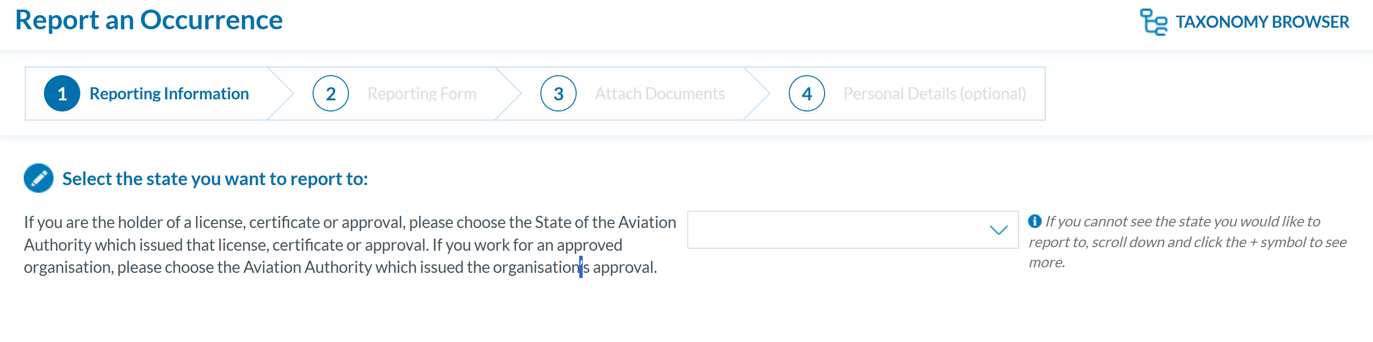The Taxonomy Browser is also accessible via the link located at the top right corner of the 'Report an Occurrence' page.':