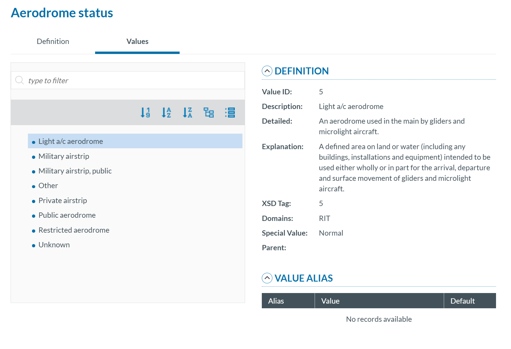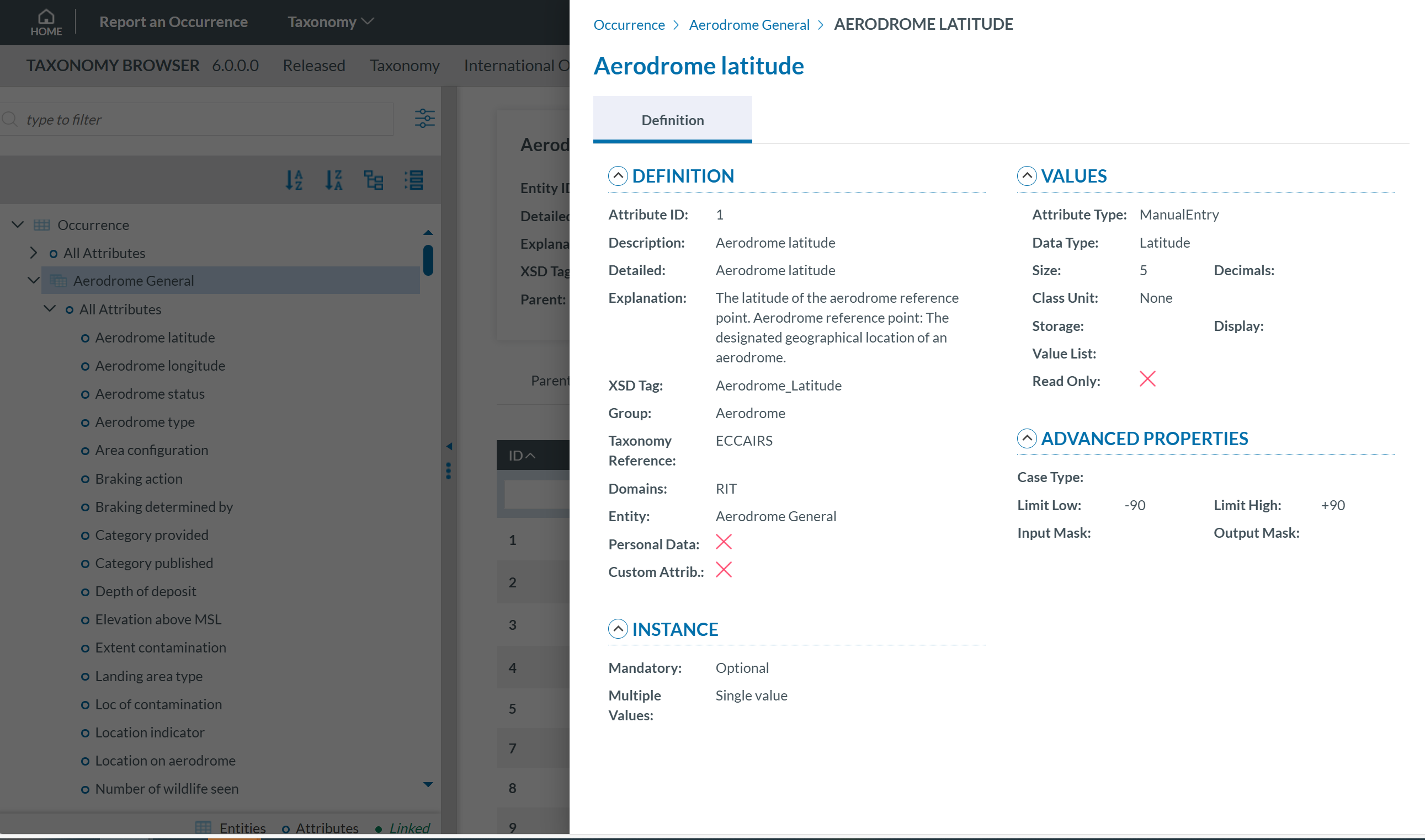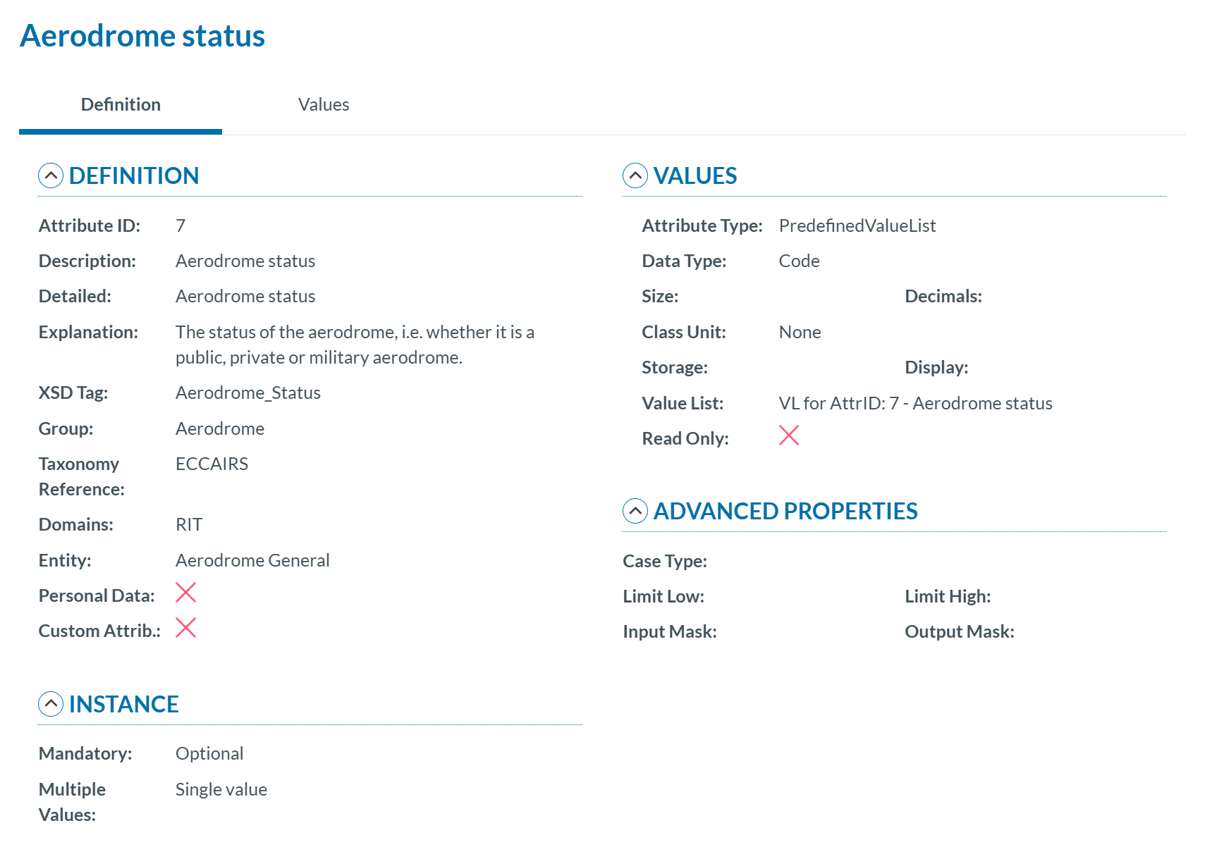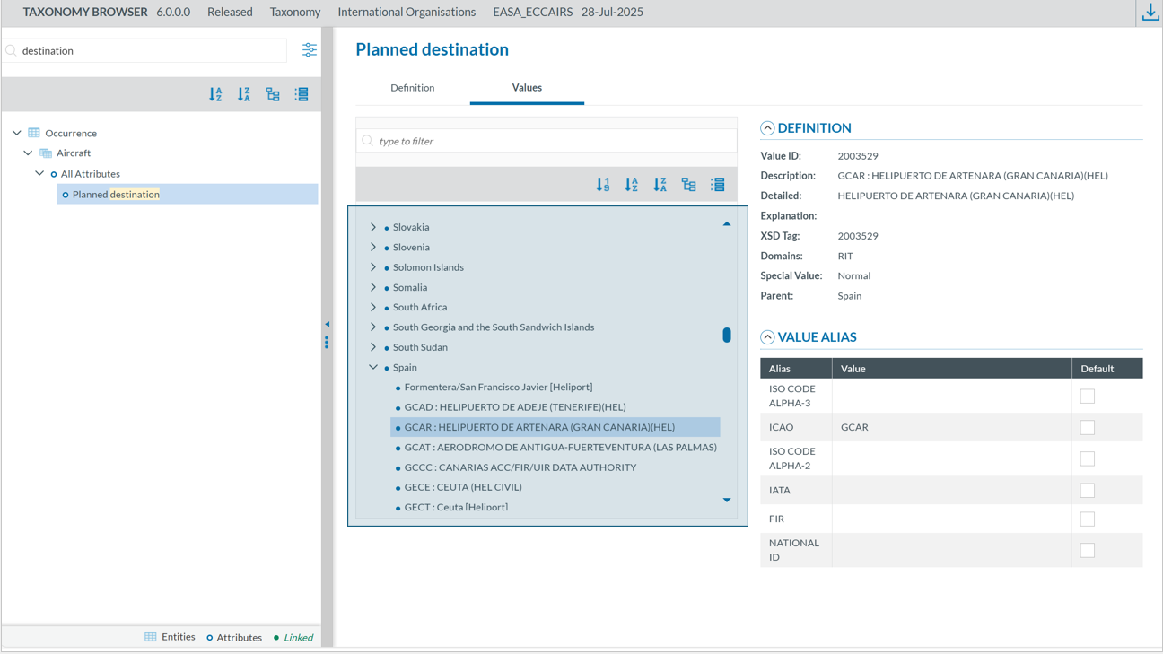 - Values: If the attribute has a predefined value list, you can navigate through the values in the Values Tree by clicking on each element. The selected value will display its definition. Values can be searched by Taxonomy Code or Description and can be sorted alphabetically.