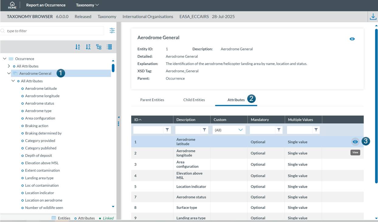 - Locate the attribute in the Taxonomy Tree and click on it (1). The information will then be displayed in the right-hand pane.