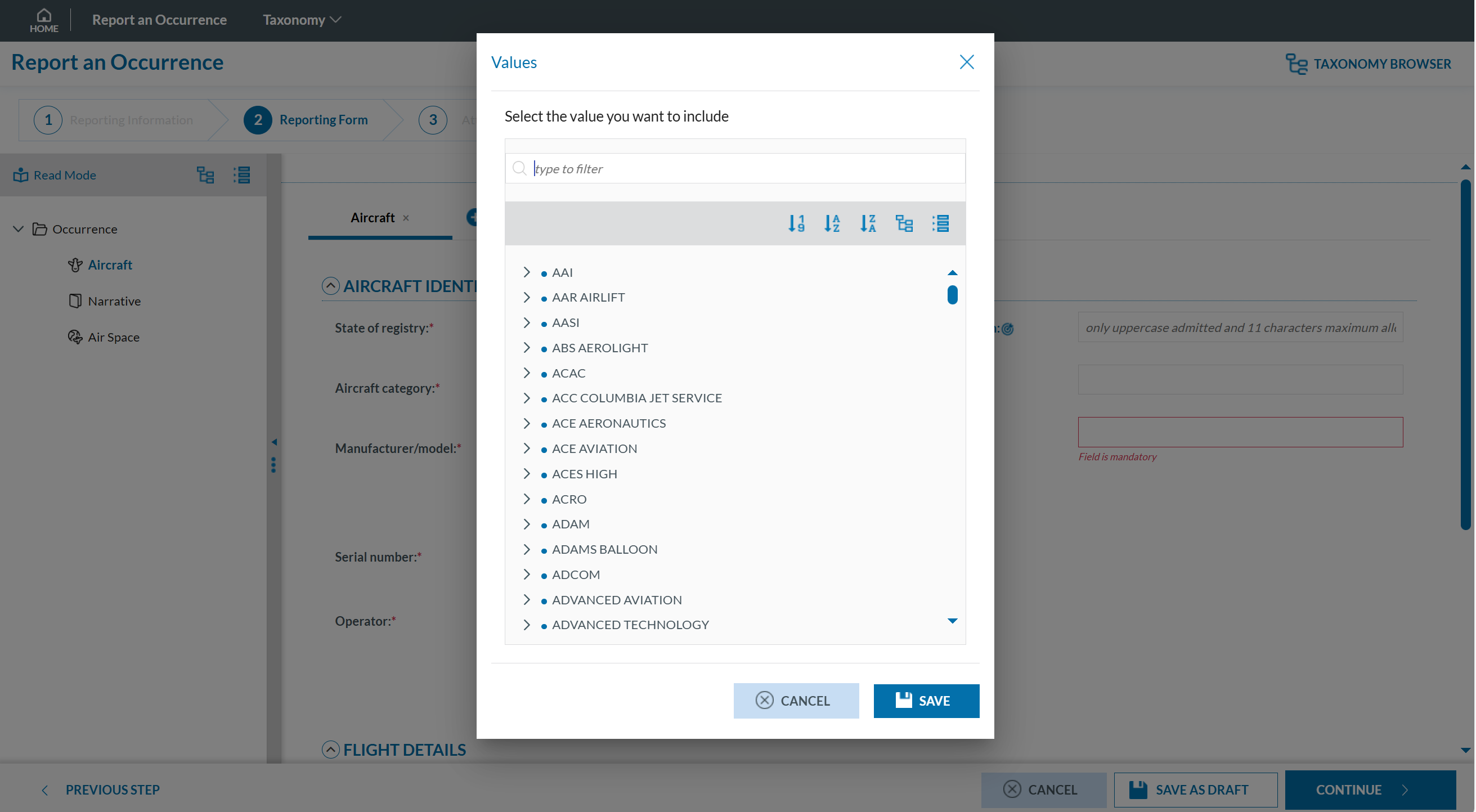 Depending on the attribute type, values may either be manually entered or selected from a predefined list (Value List). For example, for the Manufacturer/Model of an aircraft, a value can be chosen from a Value List: