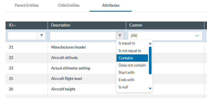 You can filter the Parent Entities, Child Entities and Attributes table by typing the term to be searched in the filter row. You can restrict the results by clicking the 'filter' icon